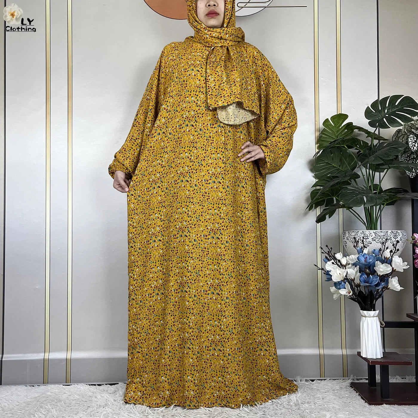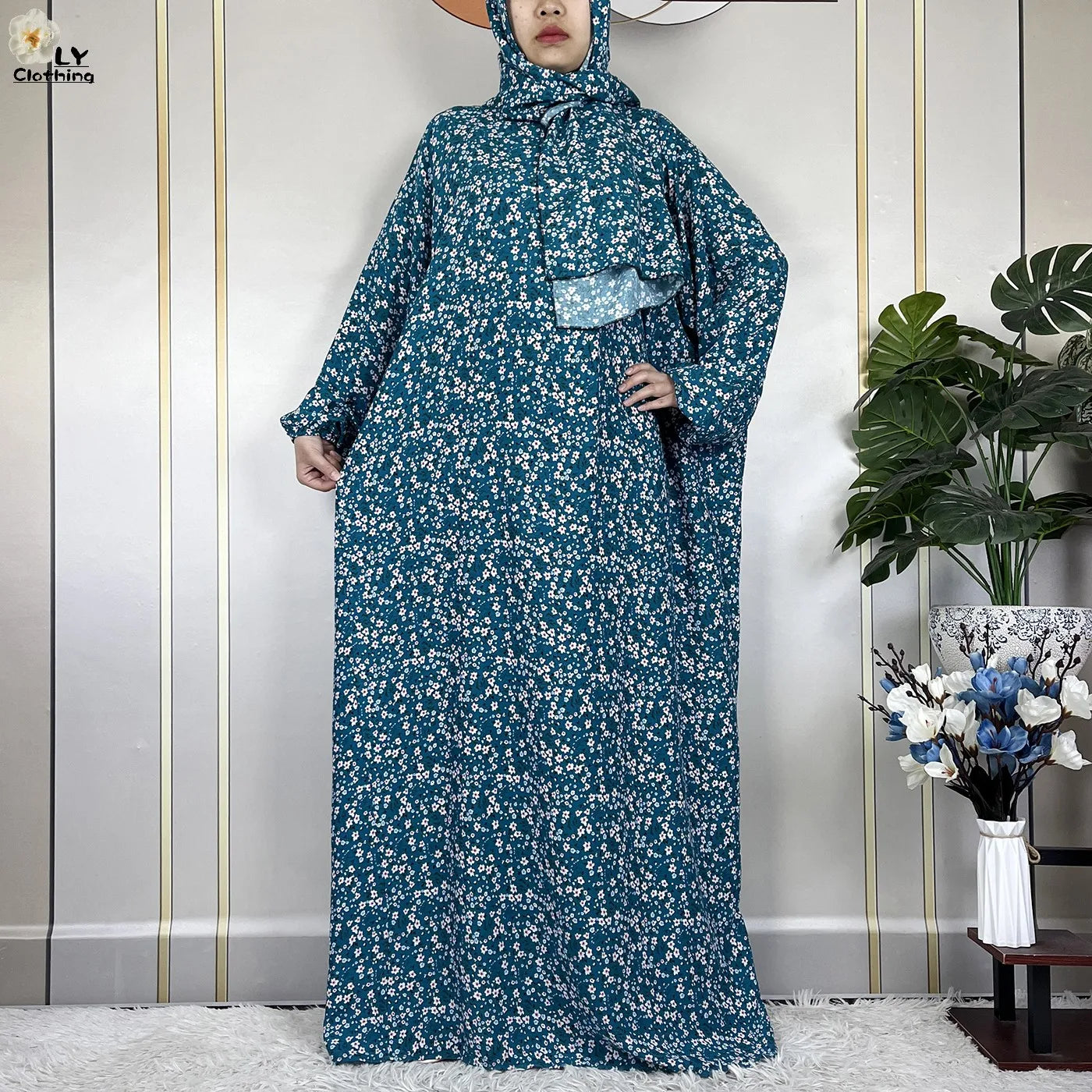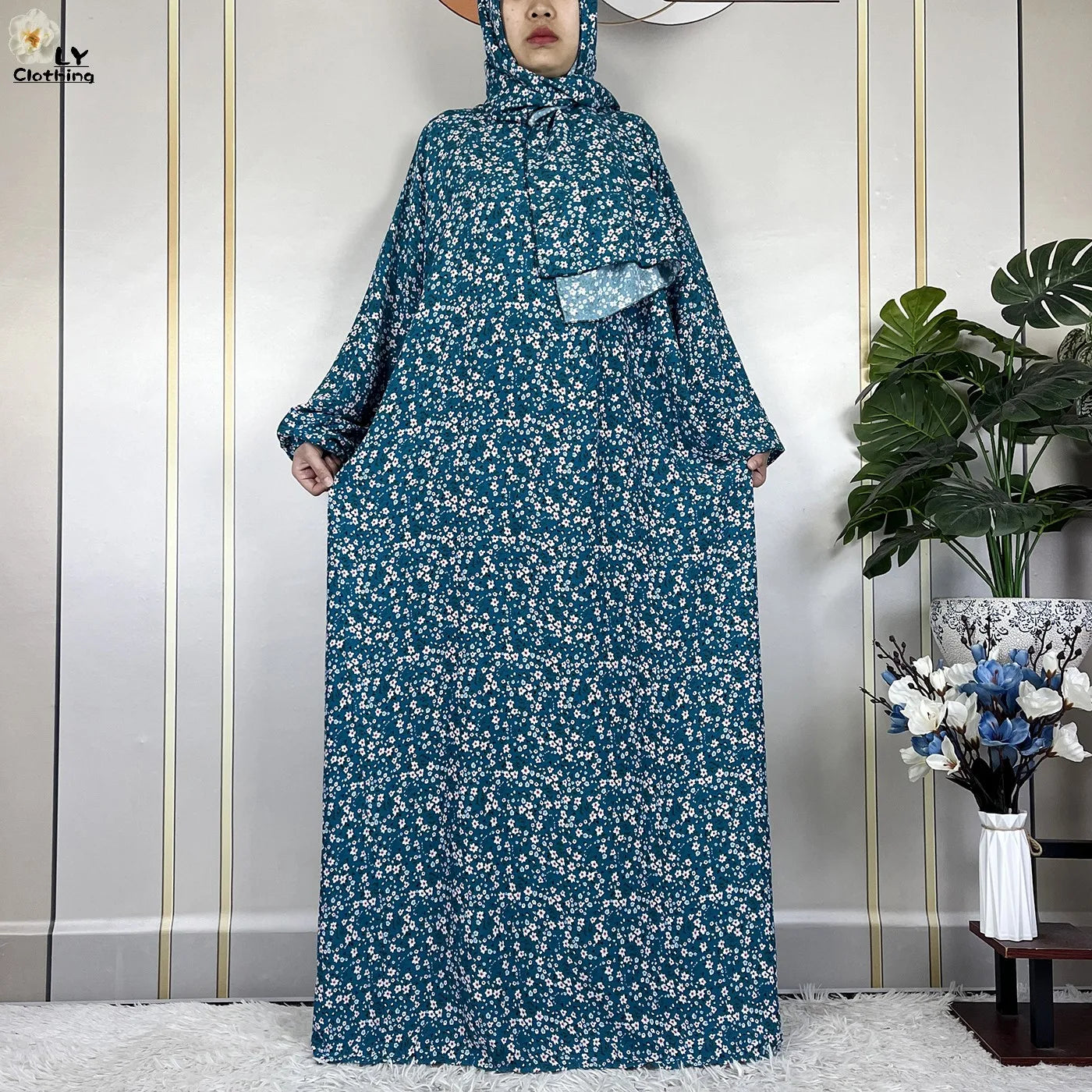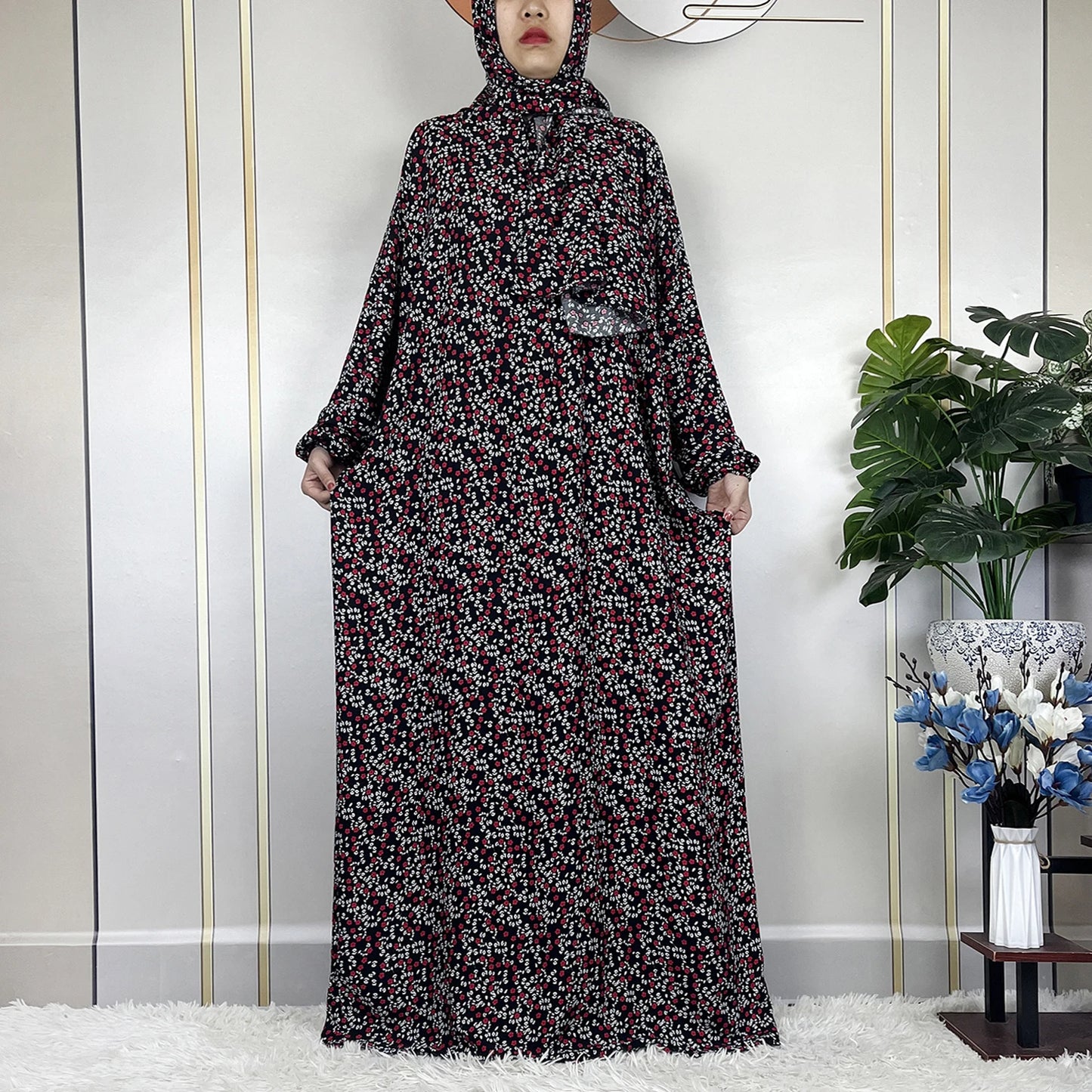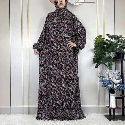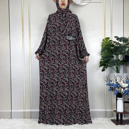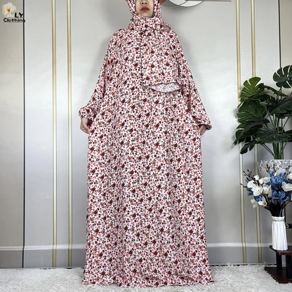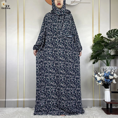 Honor your faith and style with this 2024 Floral Cotton Double-Hat Abaya, thoughtfully designed for prayer, everyday wear, and festive occasions. Crafted from breathable cotton, this maxi robe features a charming floral print and comes complete with an attached turban and an extra hat for versatile coverage.