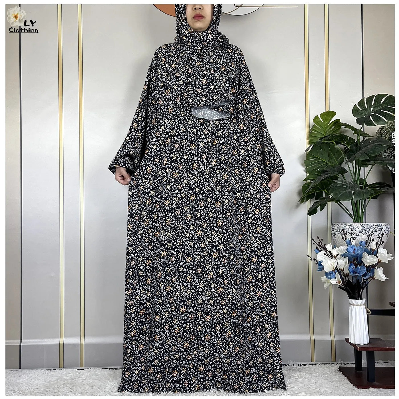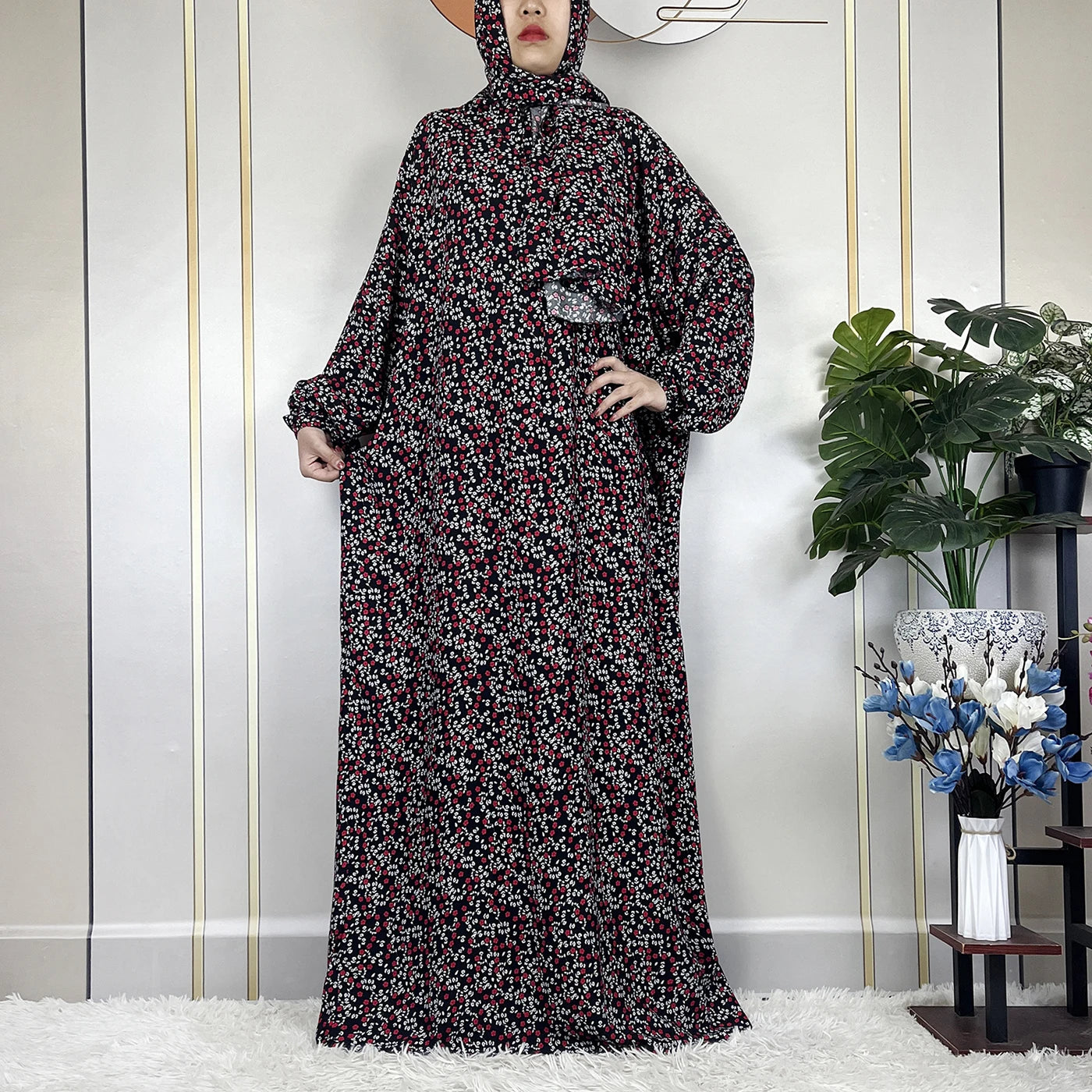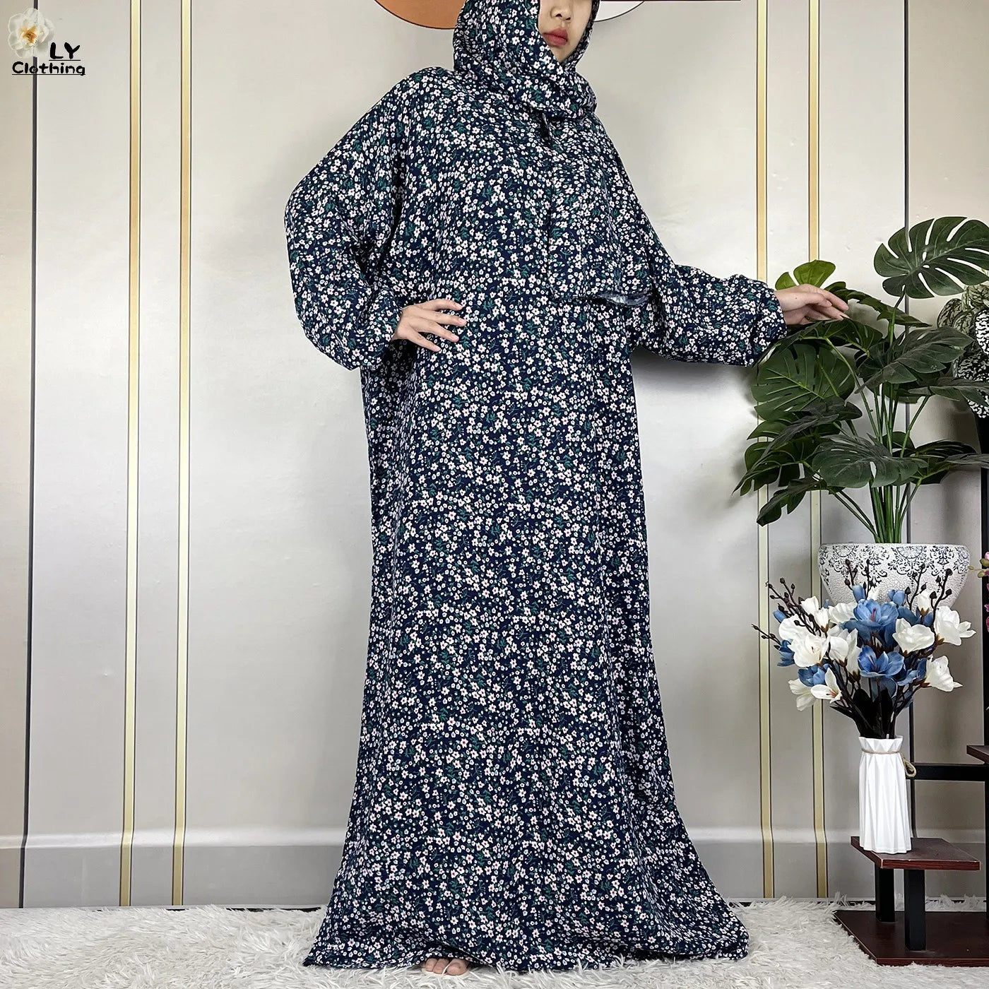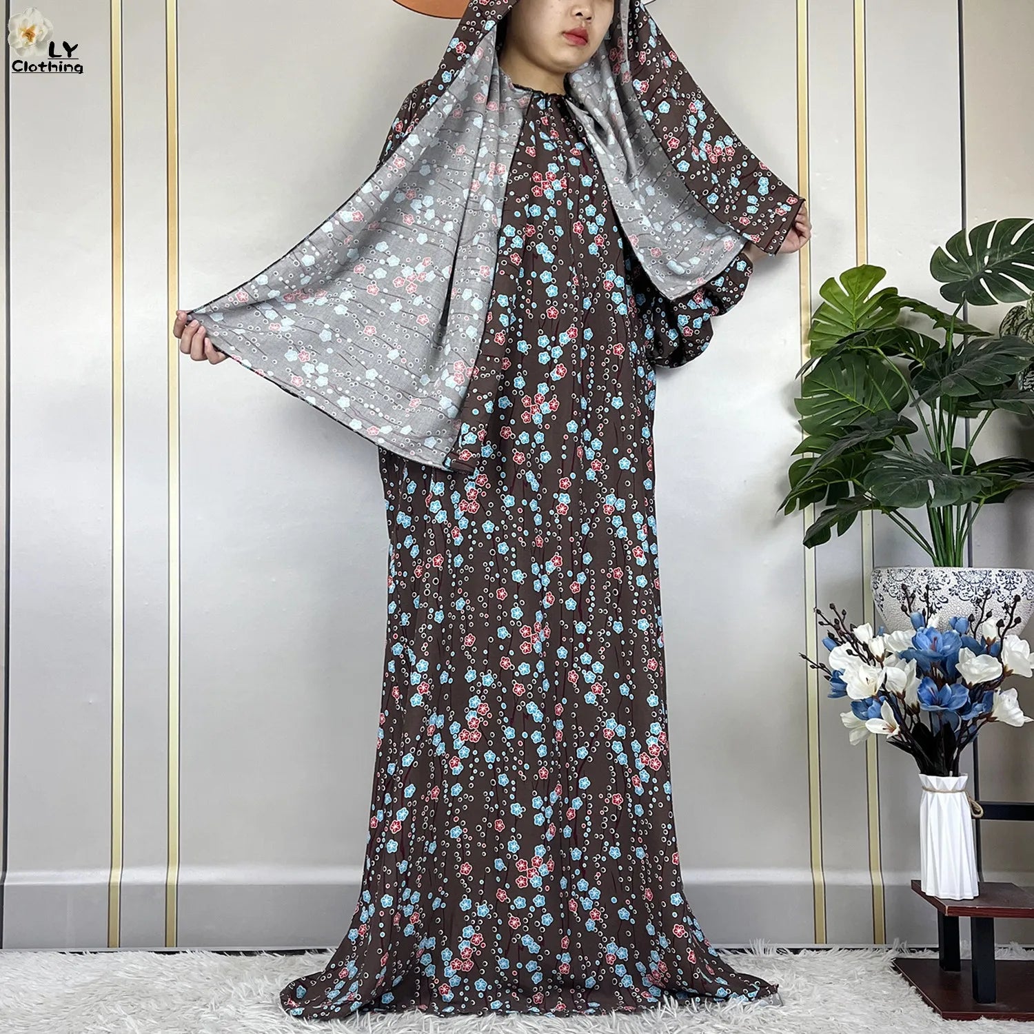 Honor your faith and style with this 2024 Floral Cotton Double-Hat Abaya, thoughtfully designed for prayer, everyday wear, and festive occasions. Crafted from breathable cotton, this maxi robe features a charming floral print and comes complete with an attached turban and an extra hat for versatile coverage.