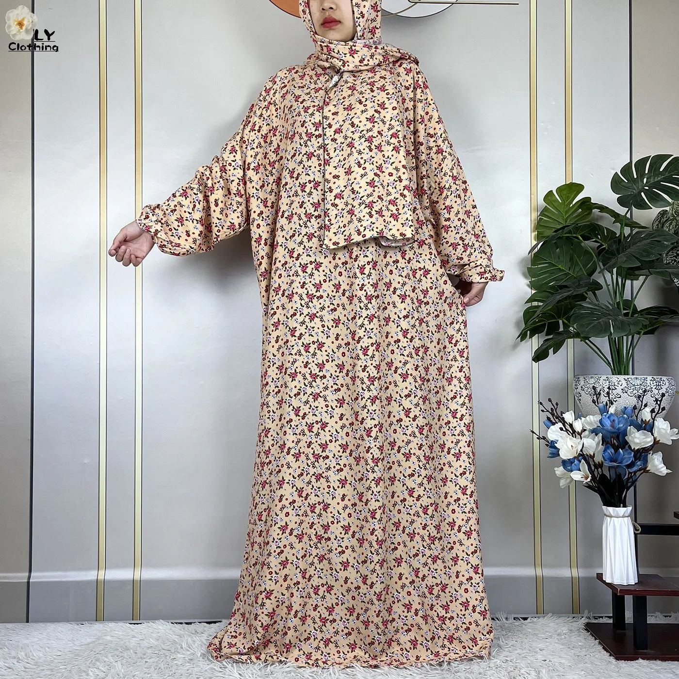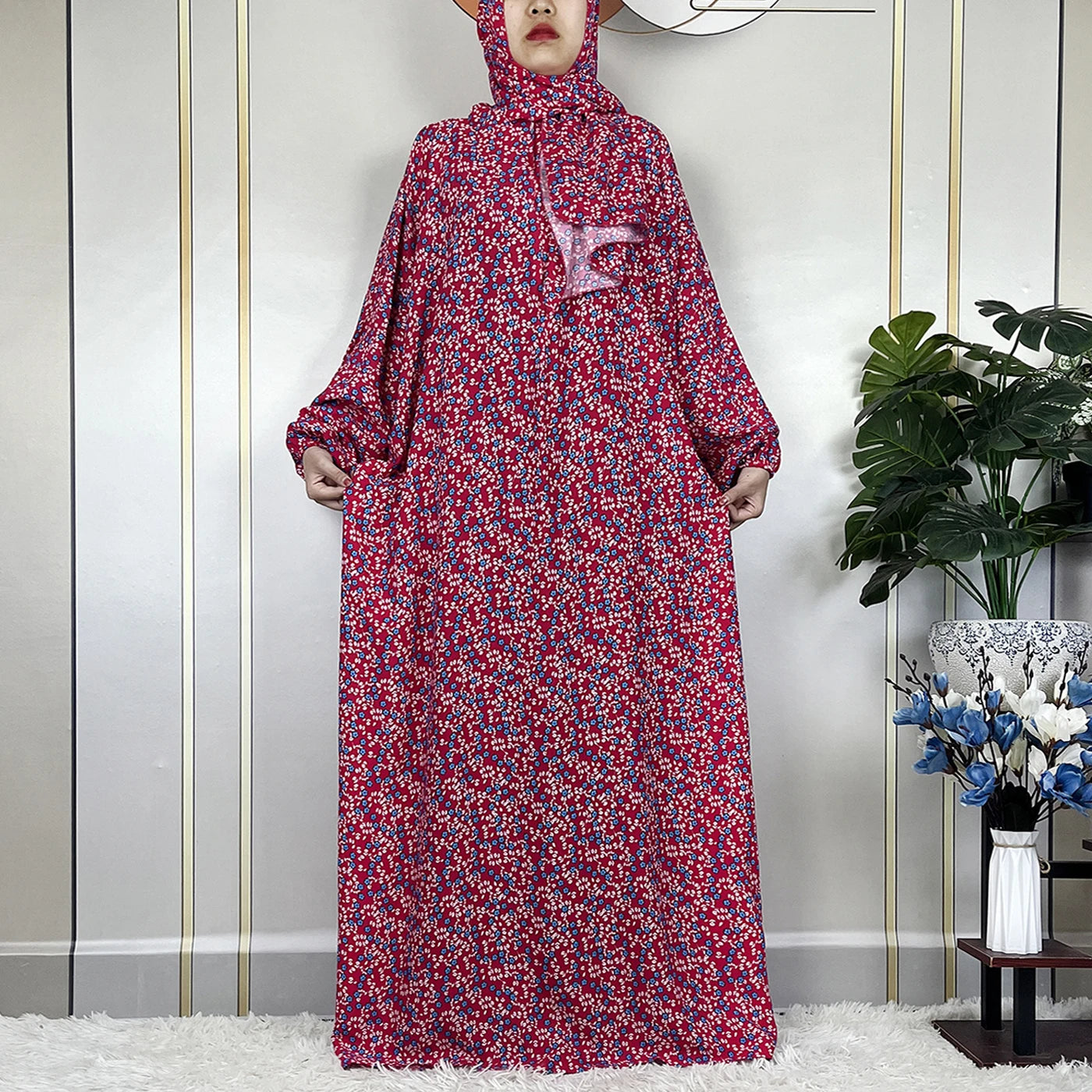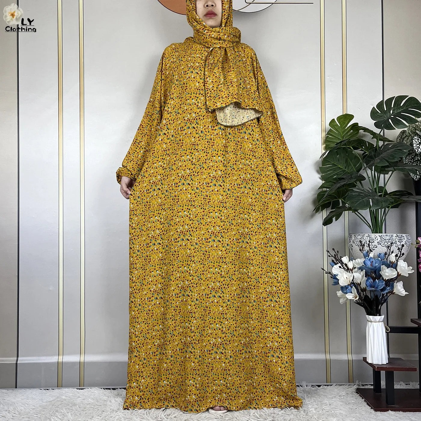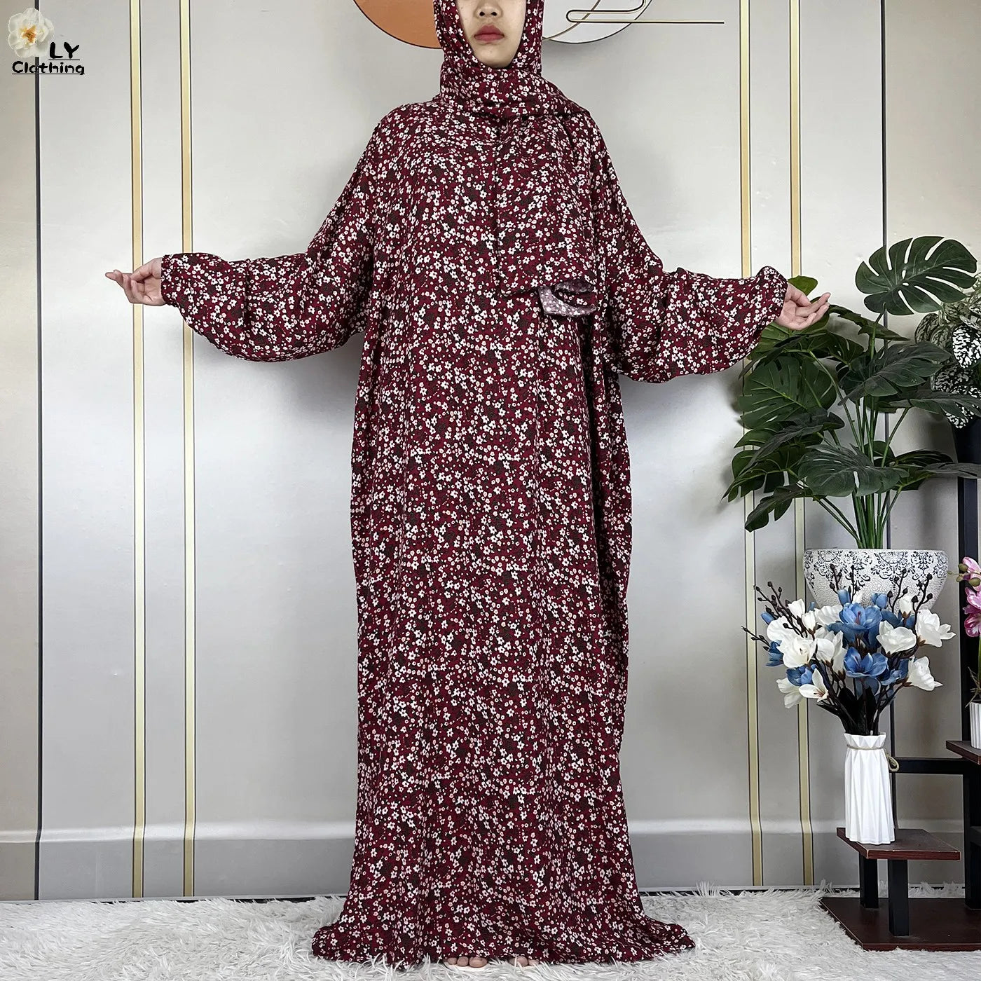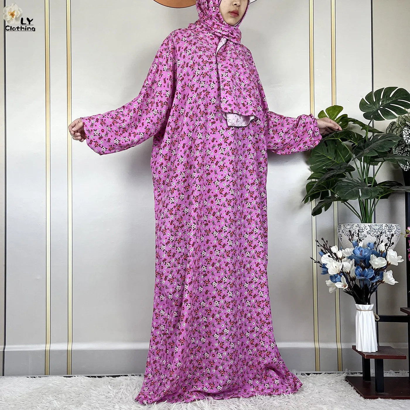 Honor your faith and style with this 2024 Floral Cotton Double-Hat Abaya, thoughtfully designed for prayer, everyday wear, and festive occasions. Crafted from breathable cotton, this maxi robe features a charming floral print and comes complete with an attached turban and an extra hat for versatile coverage.