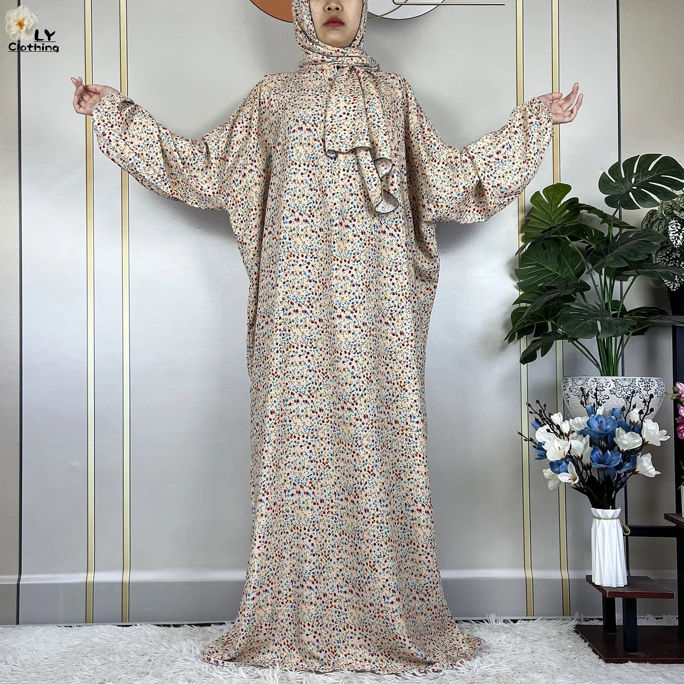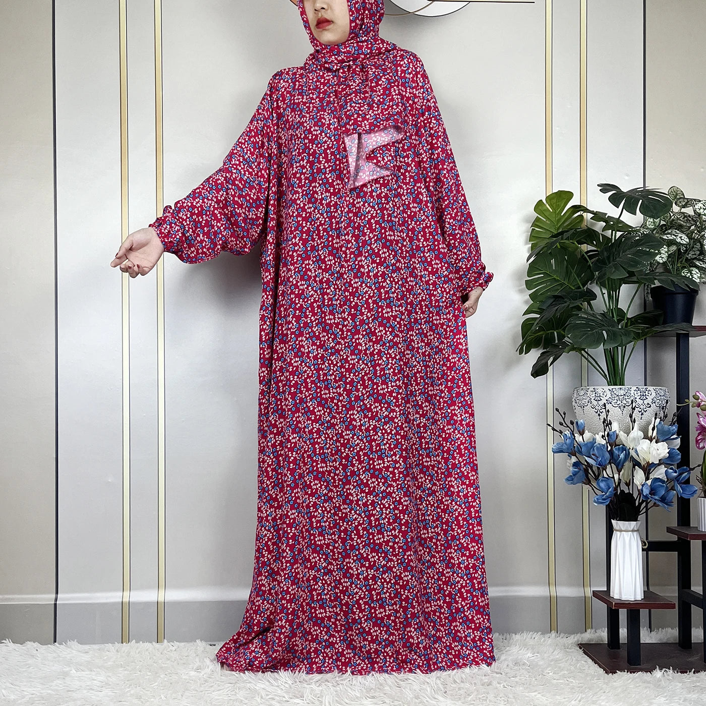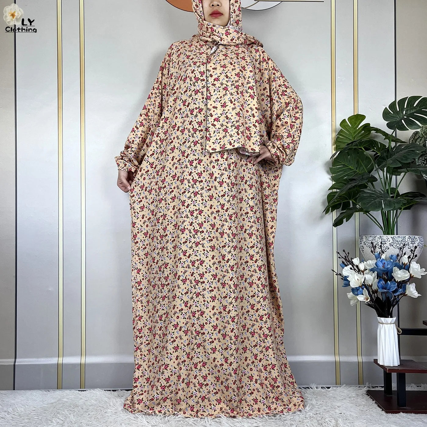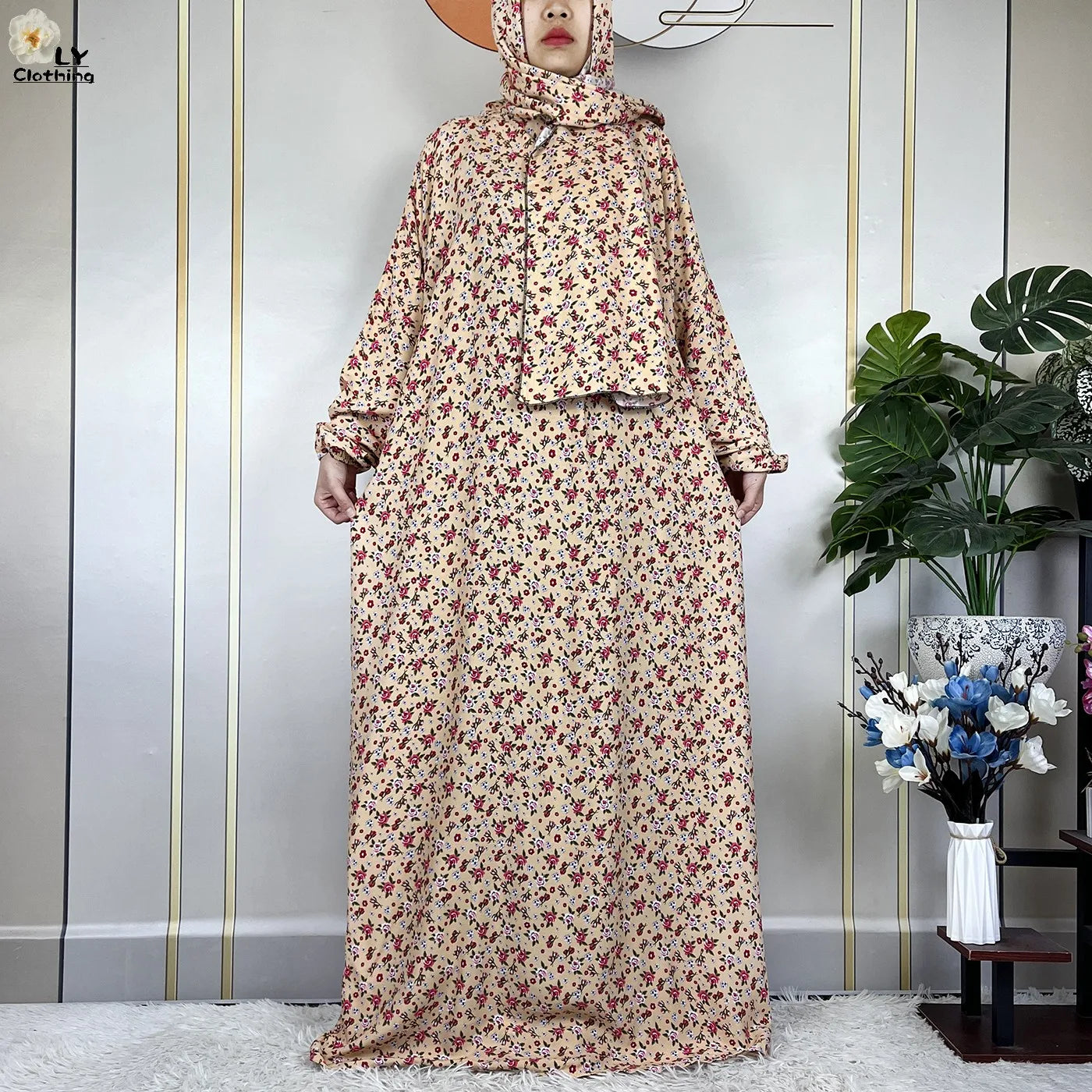 Honor your faith and style with this 2024 Floral Cotton Double-Hat Abaya, thoughtfully designed for prayer, everyday wear, and festive occasions. Crafted from breathable cotton, this maxi robe features a charming floral print and comes complete with an attached turban and an extra hat for versatile coverage.