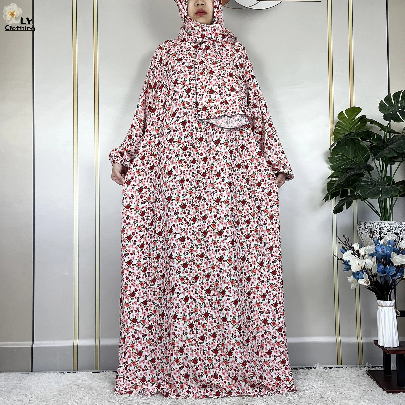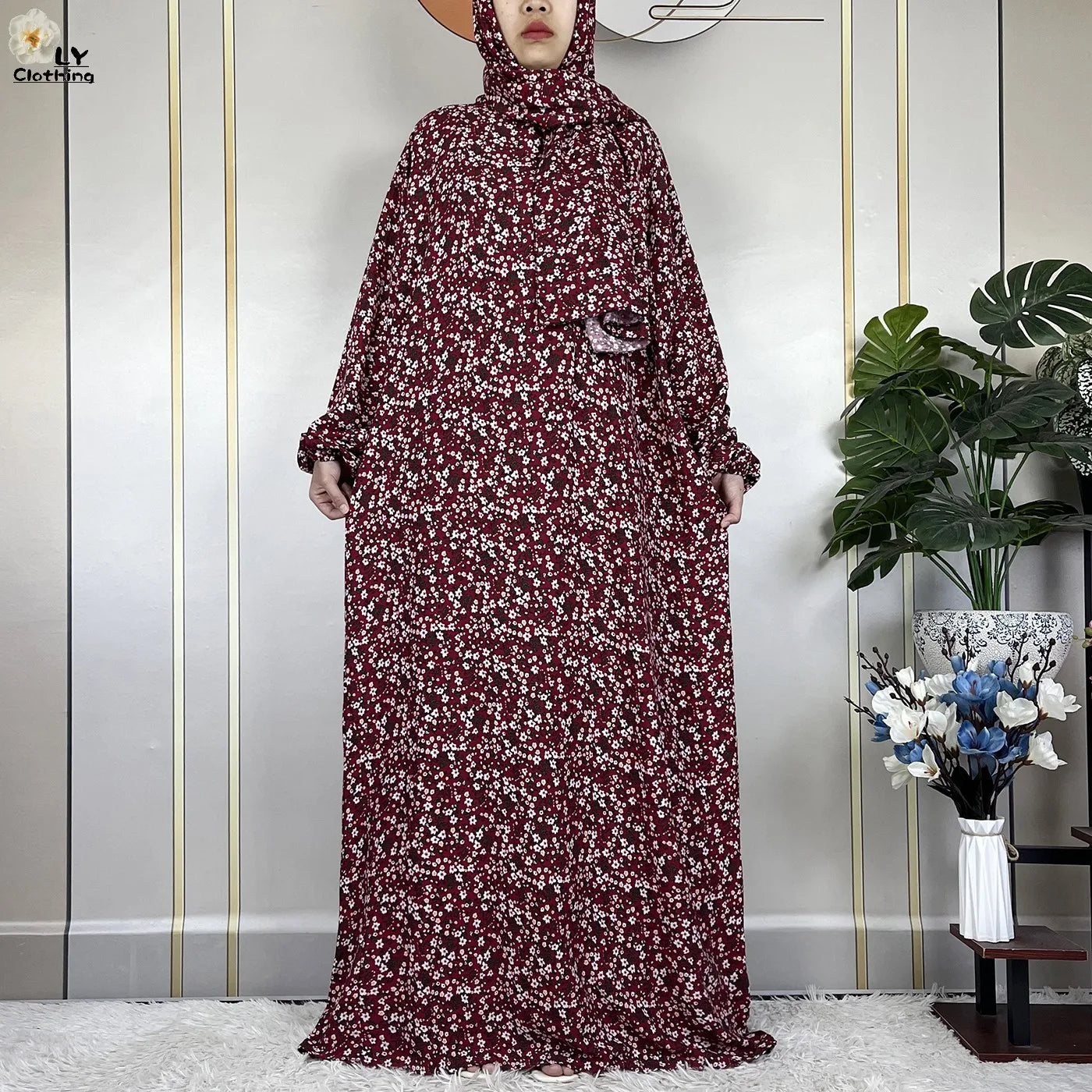 Floral Maxi Silhouette: Loose-fit design with a modest round neckline and long sleeves, providing full coverage without compromising freedom of movement .