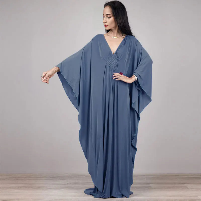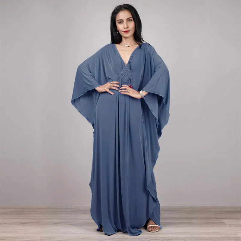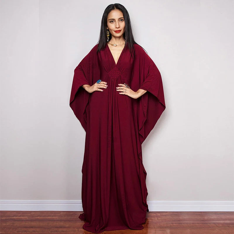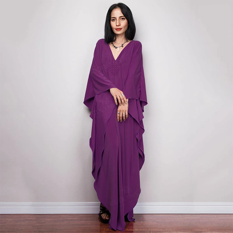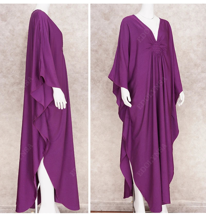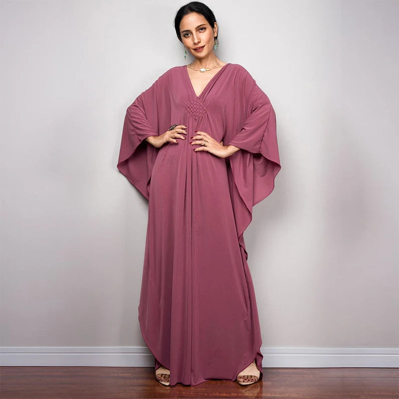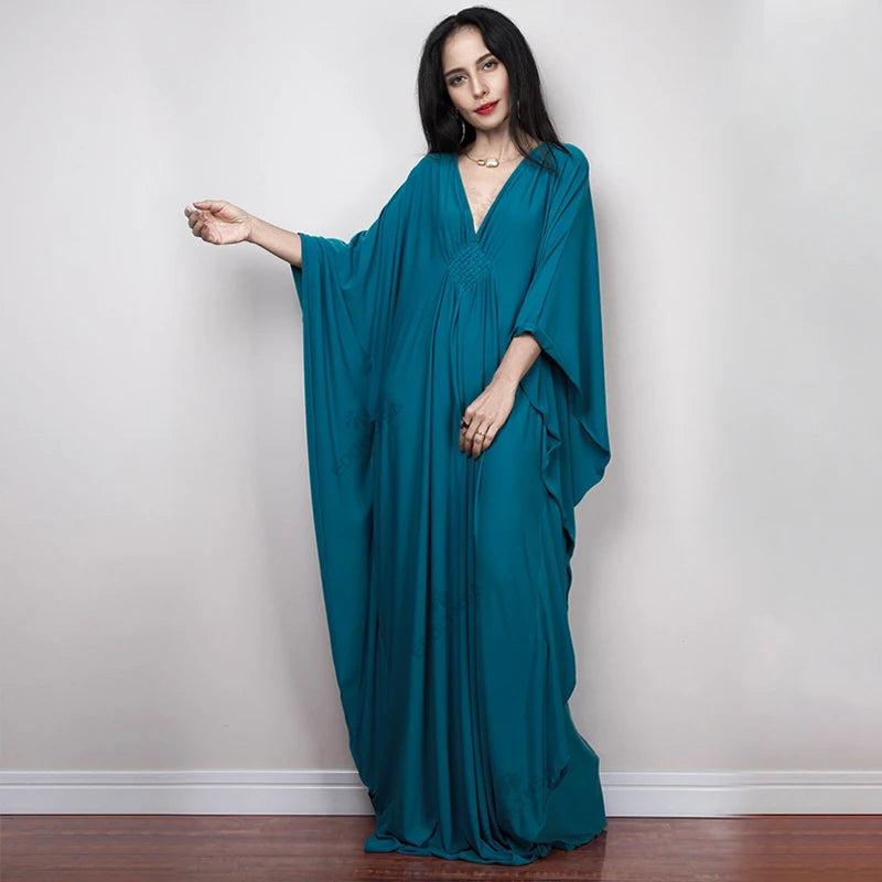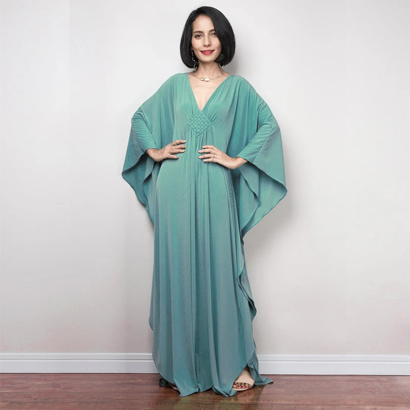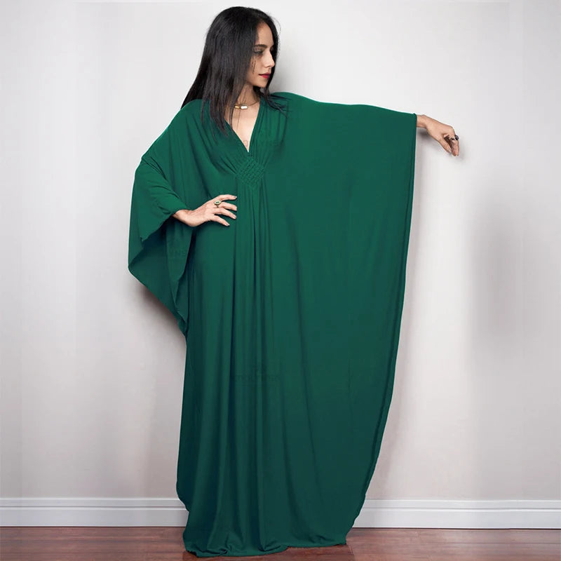 Step into summer with the Multicolor V‑Neck Batwing Sleeve Kaftan Maxi Dress (Q1306)—a vibrant and comfortable choice for beach outings, resort vacations, or casual lounging. Designed to flatter and flow, this dress offers both style and ease for plus-size women seeking elegance without compromise.