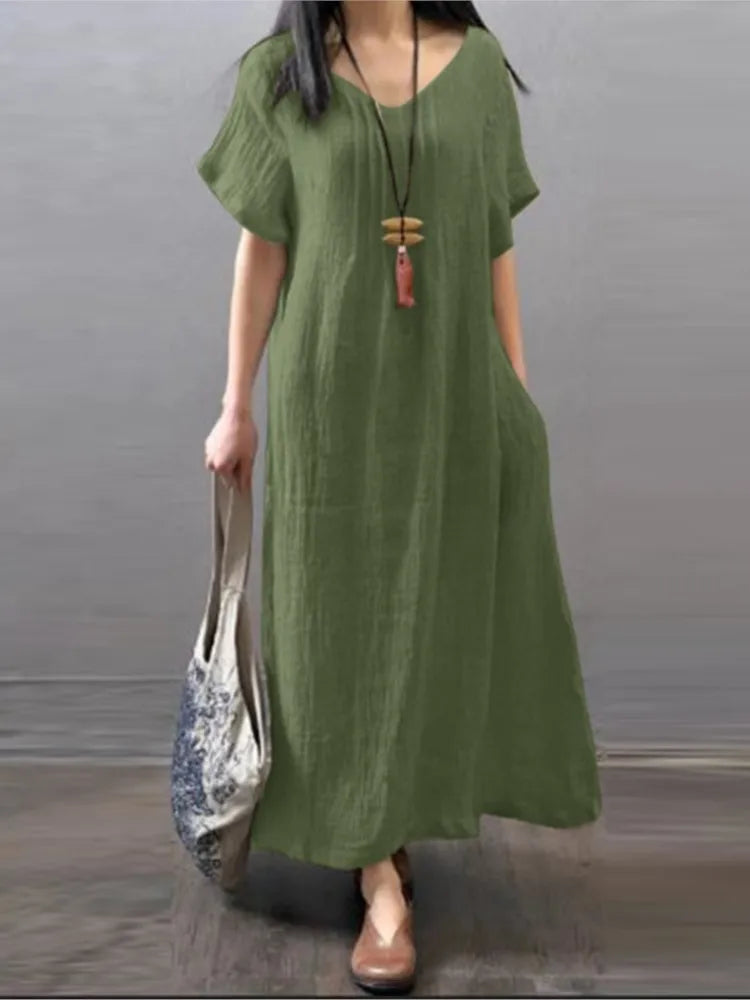 Refresh your wardrobe with the V‑Neck Cotton-Linen A‑Line Pocket Dress, a breezy staple designed for effortless spring and summer style. Made from a soft, breathable blend of cotton and linen, this dress offers a relaxed, flattering A-line silhouette with practical side pockets—perfect for casual days or outdoor gatherings. The classic V-neckline adds subtle elegance, while the loose fit ensures comfort in warmer weather.